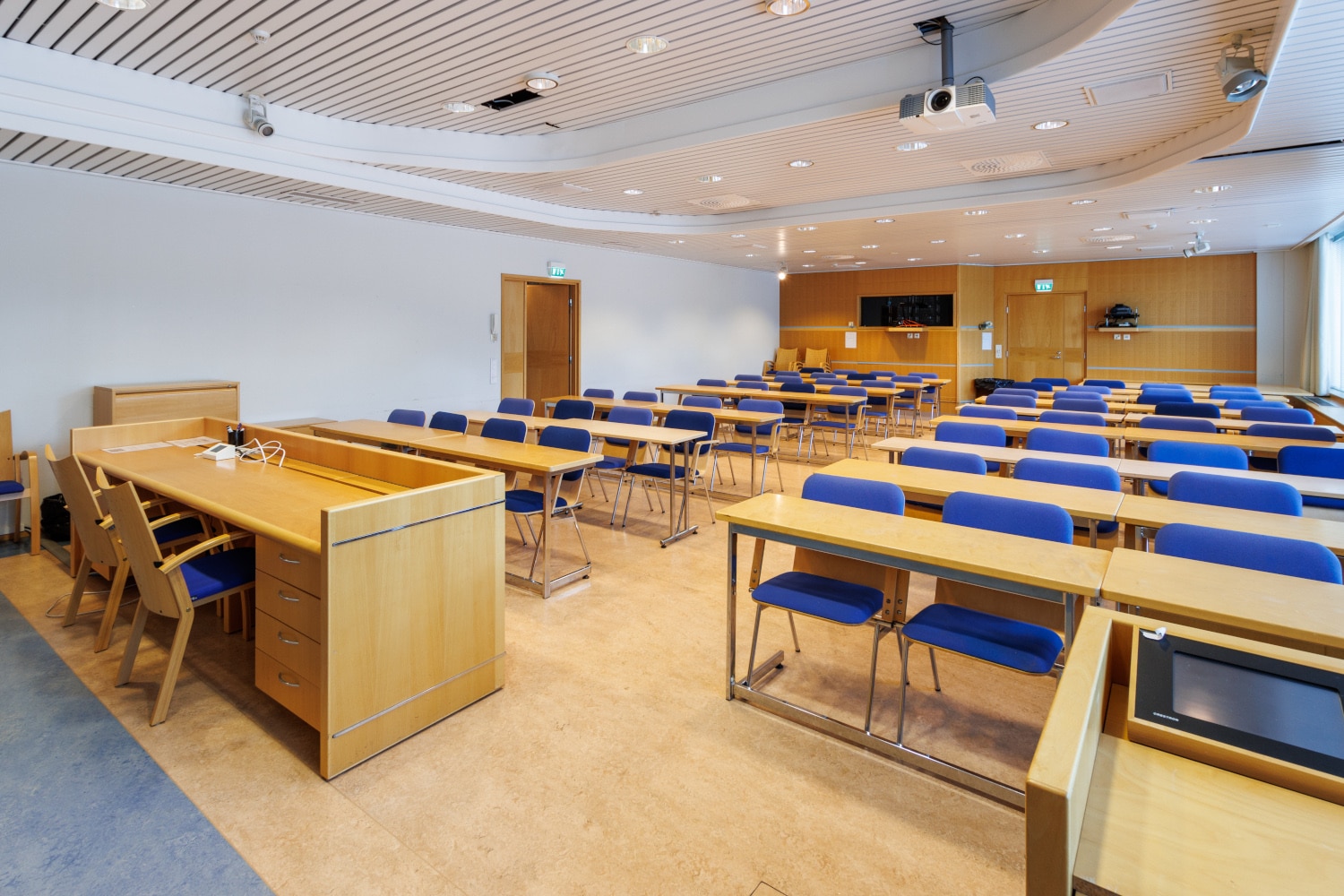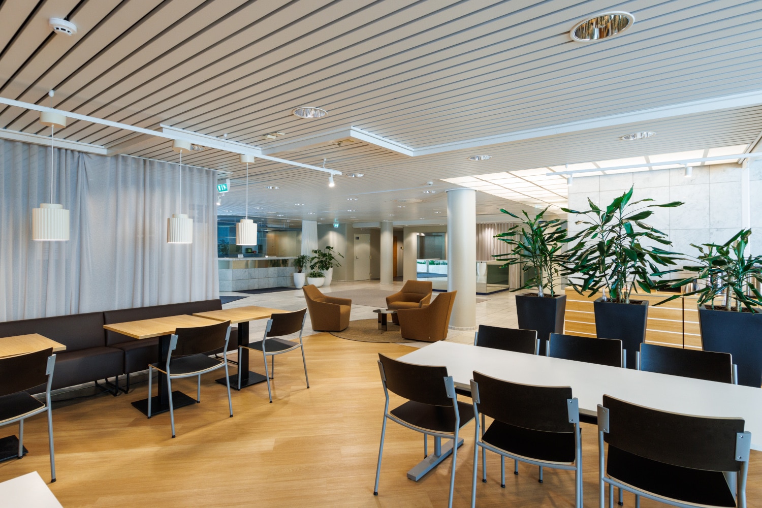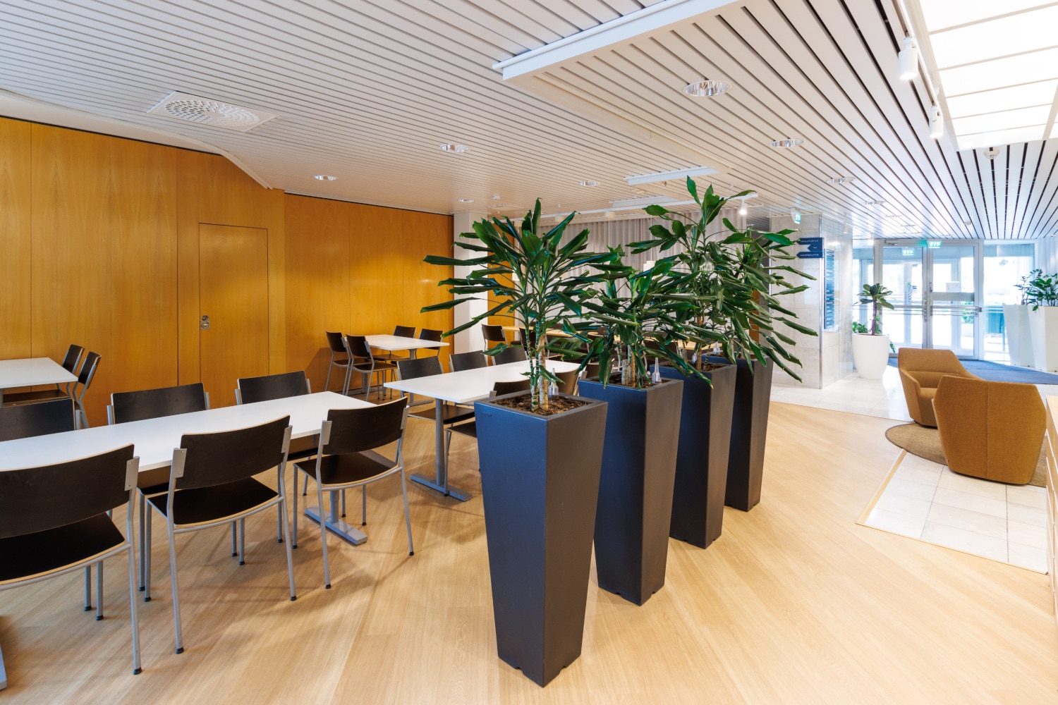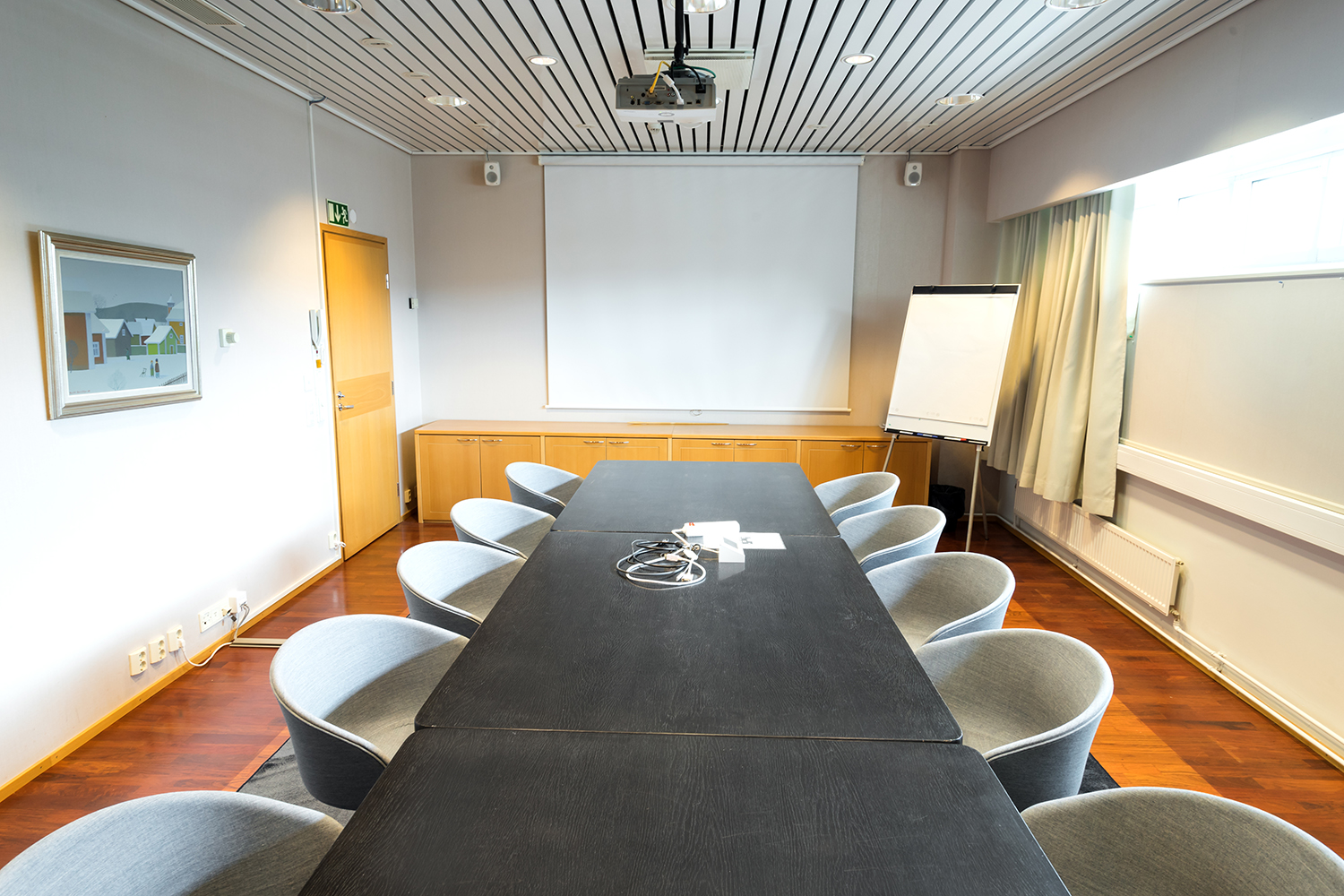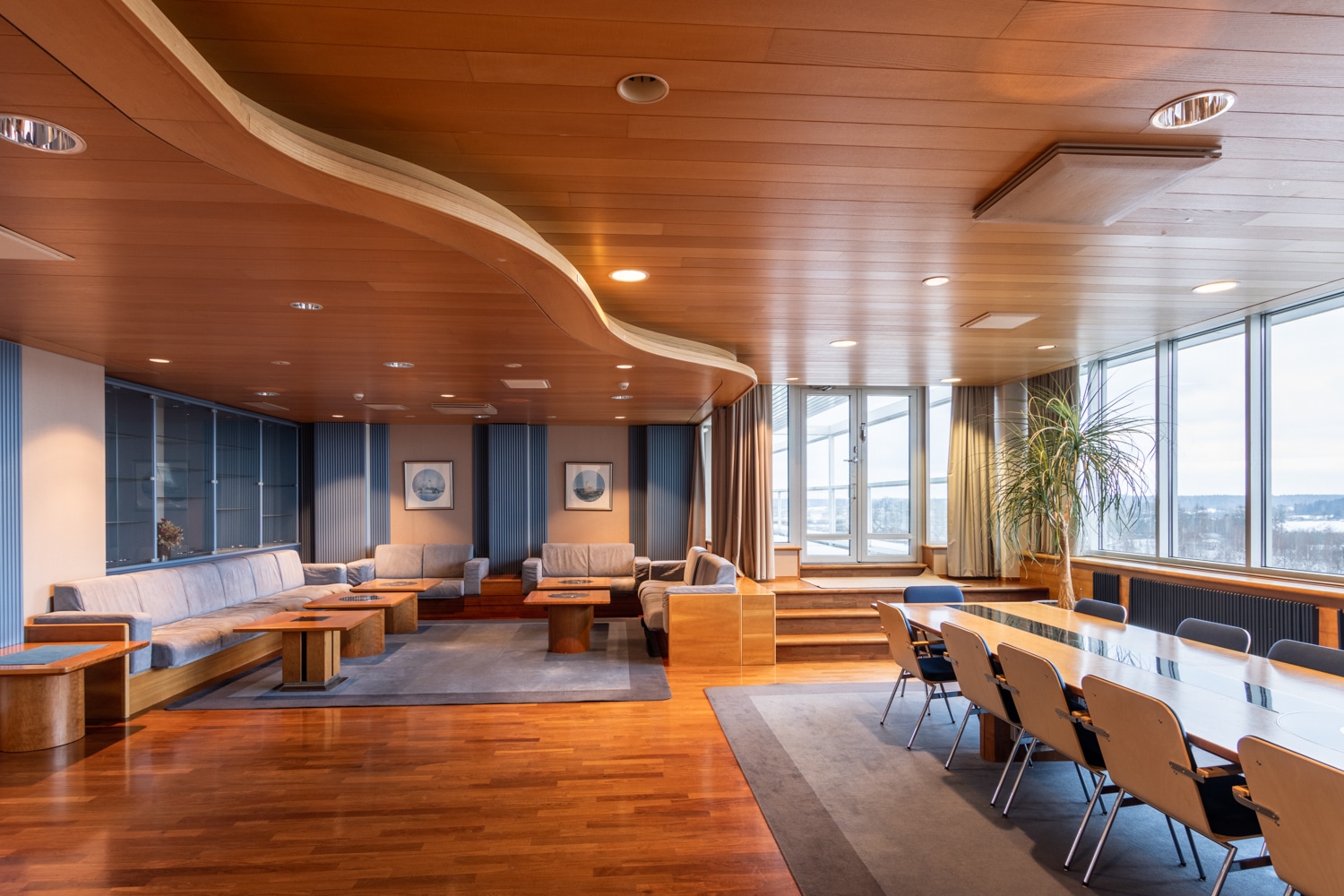 Erilaisiin tarkoituksiin sopivia kokoustiloja on sisääntulokerroksessa useita ja ylimmän kerroksen saunaosasto terasseineen on kiva paikka järjestää vaikkapa henkilökuntatilaisuuksia.